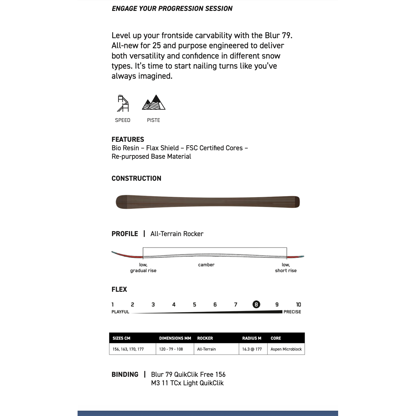 The K2 Blur 79 Skis are here for groomer cruising and all-day mountain enjoying. A stout, full wood core, and flax fiber reinforcement delivers plenty of bite on hard snow and smooth turn initiation. K2 has kept the weight of this ski down too for first chair to last call lapping.